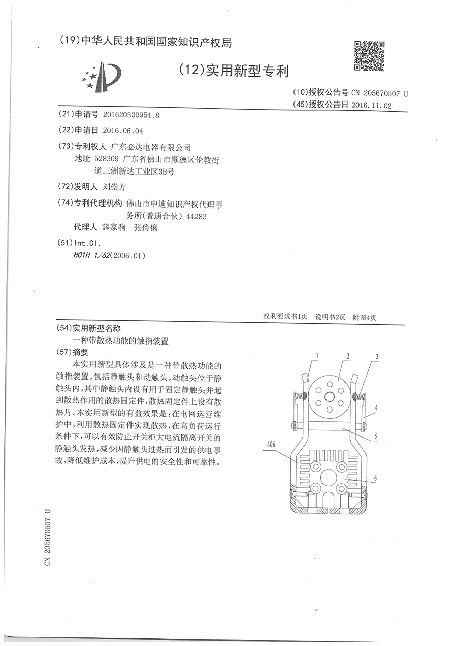 32.一种带散热功能的触指装置-实用新型专利证书(ZL201620530954.8)2016.06.04